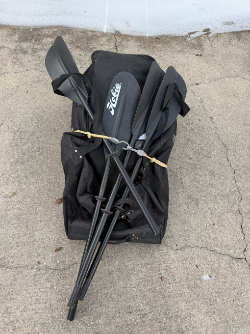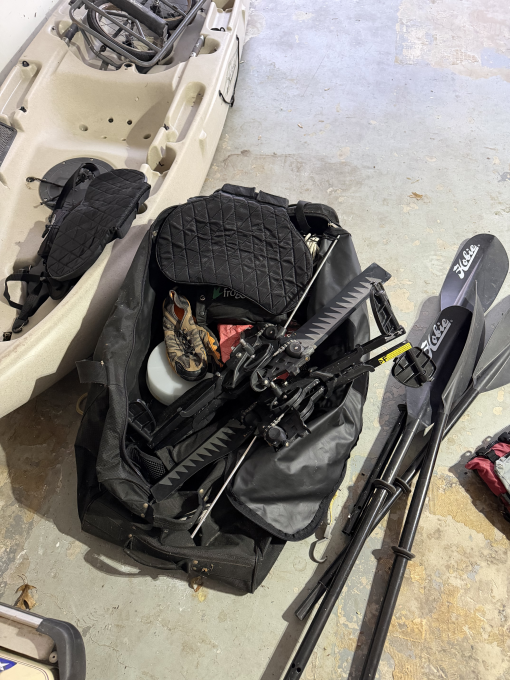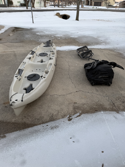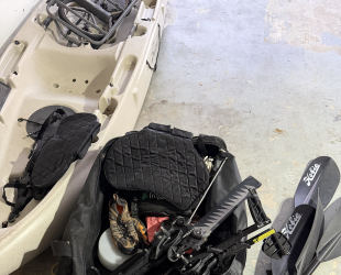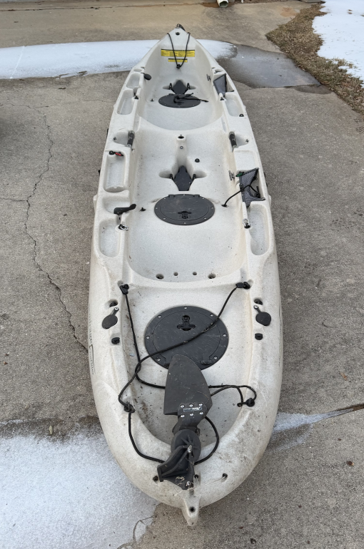 Pedal tandem kayak "Mirage Drive" 12' 8" long 34" wide 425 # capacity Good for fishing or for cruising the lake rolling equipment bag, life vests, launching cart, anchor, and transport accessories included